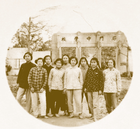 图4-6 1959年初,石门中学初三(1)班全体女“赤脚大仙”在正修建的校门前的大路合影(由石门中学档案室提供)