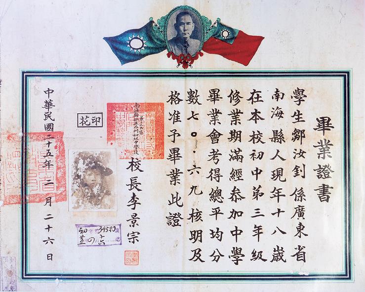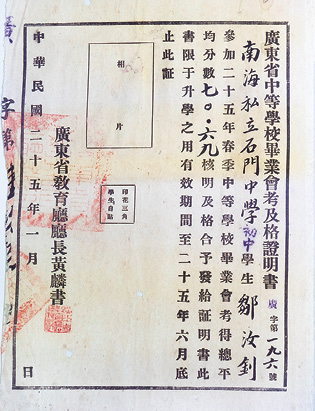 图1-38 广东省中等学校毕业会考及格证明书(1936年1月)