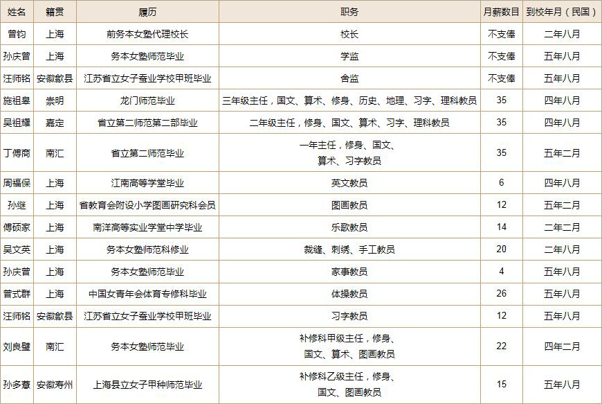 从这份表中也可知女校教师的授课、工作以及月薪情况。