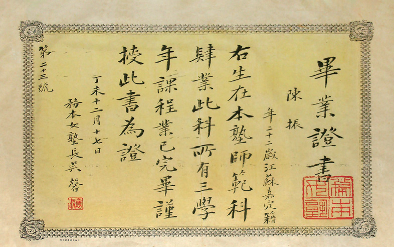 在务本女塾的毕业生中,还有几位革命烈士,其中有陈振,即陈君起,江苏嘉定(今属上海)人。1904年考入上海务本女塾,学制三年,1907年毕业于师范科,其毕业证书编号为“第二十三号”(图1-35),陈振时年22岁。后在南京任教师。1922年,受共产党员谢远定等人的影响,她参加了革命活动。1923年底,谢远定组织南京妇女问题研究会,此时她已叫陈君起,为该会负责人。1924年,陈君起参加了改组后的中国国民党,同年加入中国共产党。1925年,参加南京市声援上海五卅惨案的大会。曾任中共南京地委妇女委员兼国民党南京市党部妇女部长等职。1927年4月11日,陈君起被国民党政府逮捕,14日遭秘密杀害。年仅42岁。