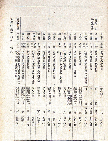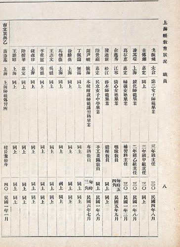 图1-30 《上海全县公立学校职教员一览表》中的“县立第一女子高等小学校”部分(1917年8月),选自《上海县教育状况》(1917年)