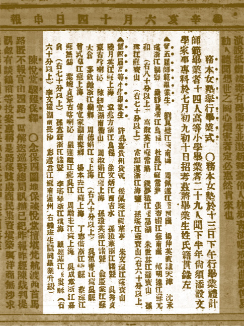 感谢《申报》为务本留下一份珍贵的名录。这份名录涉及务本女塾毕业生37人,其中以苏州籍(吴县、元和、昆山、常熟、太仓等皆是)居多,有10人;有来自浙江的杭州、嘉兴、湖州、绍兴各地共11人;今属上海地区(嘉定、宝山、南汇、上海)有8位;还有来自常州、南通等地,也有籍贯安徽桐城、湖北江陵的。(图1-32)