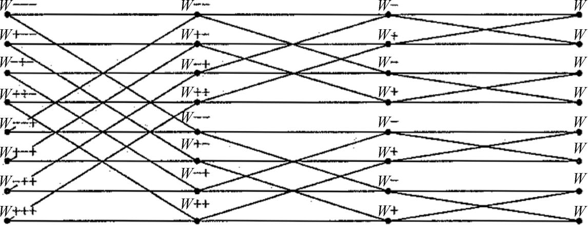 Polar码是基于信道极化理论构造的,将一组二进制码元输入离散无记忆信道,通过信道合成和信道分裂的操作,将得到的新的二进制码元输入离散无记忆信道,该过程称为极化过程,得到的新信道称为子信道。码长 N =8的信道极化过程及子信道示例如图2-1所示, W 是原始信道, W -和 W +是经过一级极化得到的子信道。当参与极化的信道足够多时,一部分子信道容量趋于1,称为可靠子信道,用于承载信息资源,剩下的趋于0,称为不可靠子信道,用于承载固定的已知比特,通过这种方法构造的编码就是极化码。