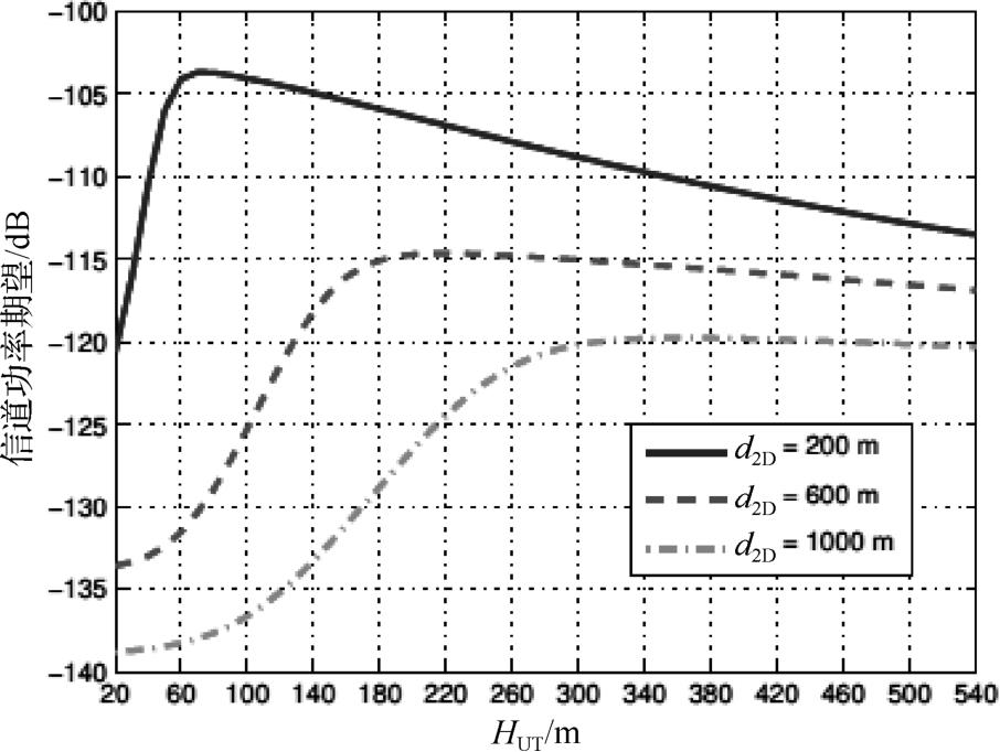 在给定 d 2D 的条件下,由于LoS链路概率的增加,信道功率期望先随 H UT 的增大递增,当LoS链路概率的增加不能弥补由链路距离变长带来的路径损耗增量时,信道功率期望开始随 H UT 的增大而递减。这种对无人机飞行高度的折中已被广泛用于无人机机载基站/中继布局的优化中。