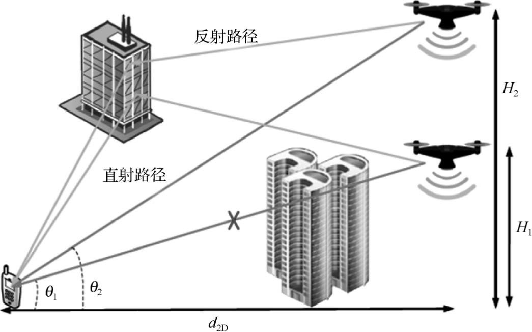 在城市中,无人机与地面基站之间的LoS链路会不时受到地面障碍物的阻挡。为了区分LoS链路和NLoS链路的不同传播环境特点,一种常用的方法是根据两种传播路径的发生概率对LoS链路和NLoS链路分别进行建模,称为概率LoS信道模型。两种传播路径的发生概率通常可以基于城市地区的统计模型得出,如该城市地区中建筑物的密度和高度等。对于给定的发射机和接收机位置,信号通过LoS链路传输的概率可通过计算在发射机和接收机的视距上没有建筑物的概率得到。针对无人机-地面通信,人们提出了不同的视距概率表达式和相应的信道模型。下面介绍基于角度参数的概率LoS信道模型。