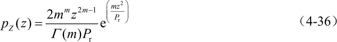 式中, P r 为接收信号的平均功率; Γ ( m )为伽马函数; m 为衰落参数。改变 m 的值,Nakagami -m 衰落可以转变为多种衰落。当 m =1时,Nakagami -m 衰落可退化为瑞利衰落;当 m =( K +1) 2 /(2 K +1)时,Nakagami -m 衰落可近似为衰落参数为 K 的莱斯衰落;当 m =∞时表示无衰落。