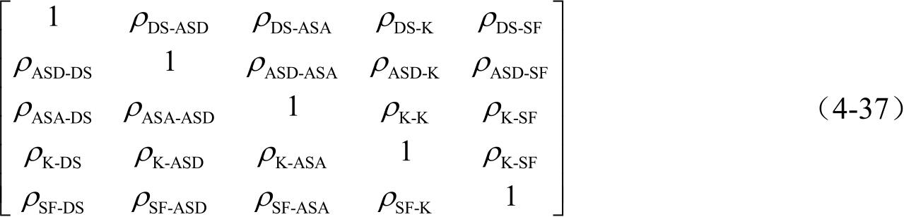 在二维信道建模中,角度扩展参数仅包括水平维两个扩展参数——ASD(Azimuth Spread of Departure Angle)和ASA(Azimuth Spread of Arrival Angle),即二维信道中共有5个参数(DS、ASD、ASA、 K 、SF),多径成分统计互相关矩阵为5×5的正定矩阵,如式(4-37)所示。