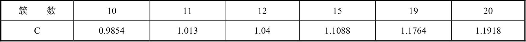 式中, P n 为多径信号的功率; σ ZSA 为角度扩展的均方根; C 为与多径数量相关的比例因子。垂直角度的比例因子 C 由实测数据分析得到,当簇数(Clusters)等于12、19、20时,比例因子取值如表4-2所示;当簇数不等于12、19、20时,垂直角度的 C 与水平角度的 C 相同。