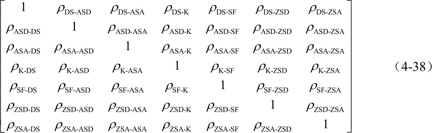 矩阵中7个参数的顺序是不固定的,可以是任意顺序;矩阵中 ρ DS-ZSD 和 ρ ZSD-DS 的意义相同,均表示参数DS与ZSD的互相关系数,其他参数意义以此类推;矩阵中对角线上的1表示同一个参数的自相关系数为1。