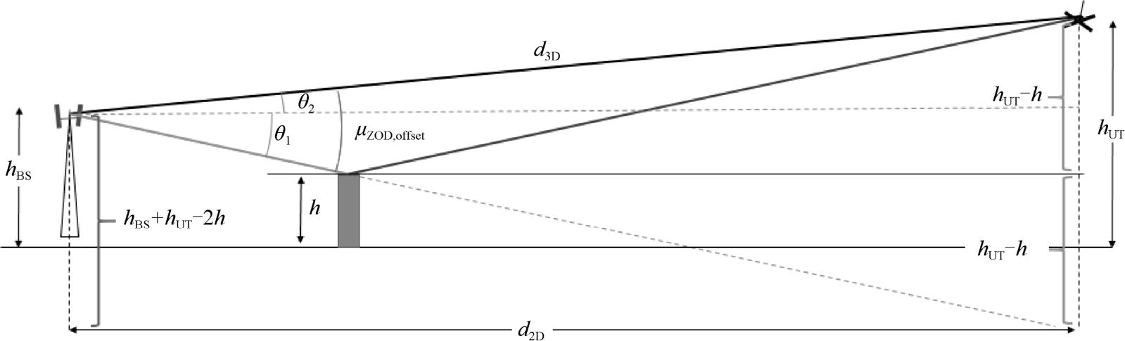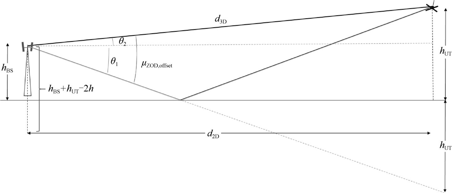 (5)对于LoS链路中的ZOD,在角度值缩放后,偏移角度仅添加到NLoS链路,即CDL-D中的所有拉普拉斯聚类。该偏移角由几何关系确定,假设RMa-AV场景在地面上以及UMa-AV在建筑物屋顶上都是镜面反射的,RMa-AV和UMa-AV场景的偏移角如图4-5和图4-6所示。