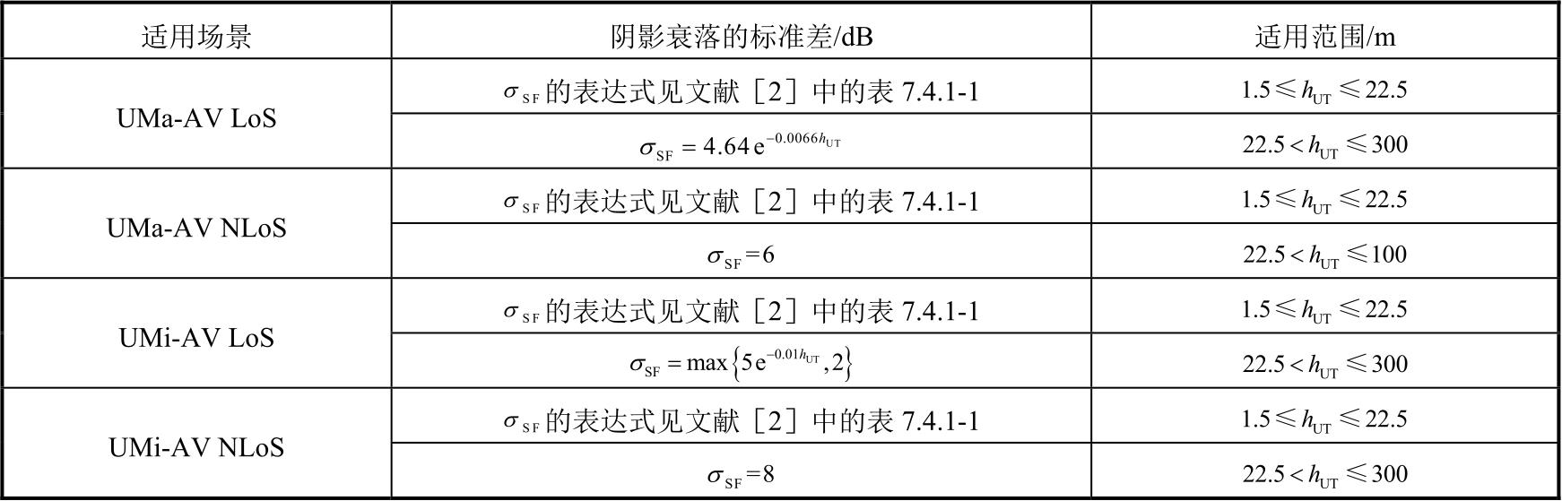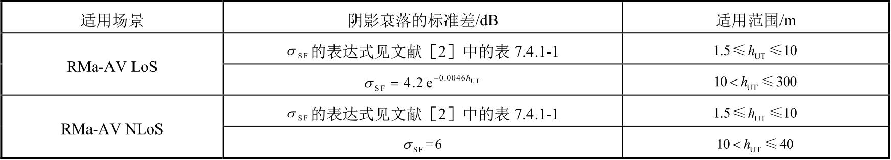 本节介绍建议信道模型中的阴影衰落模型。与路径损耗类似,建议信道模型实际上是结合基于高度参数的信道模型和概率LoS信道模型来描述不同高度的无人机信号传播环境的。不同应用场景下的阴影衰落表达式如表4-5所示。