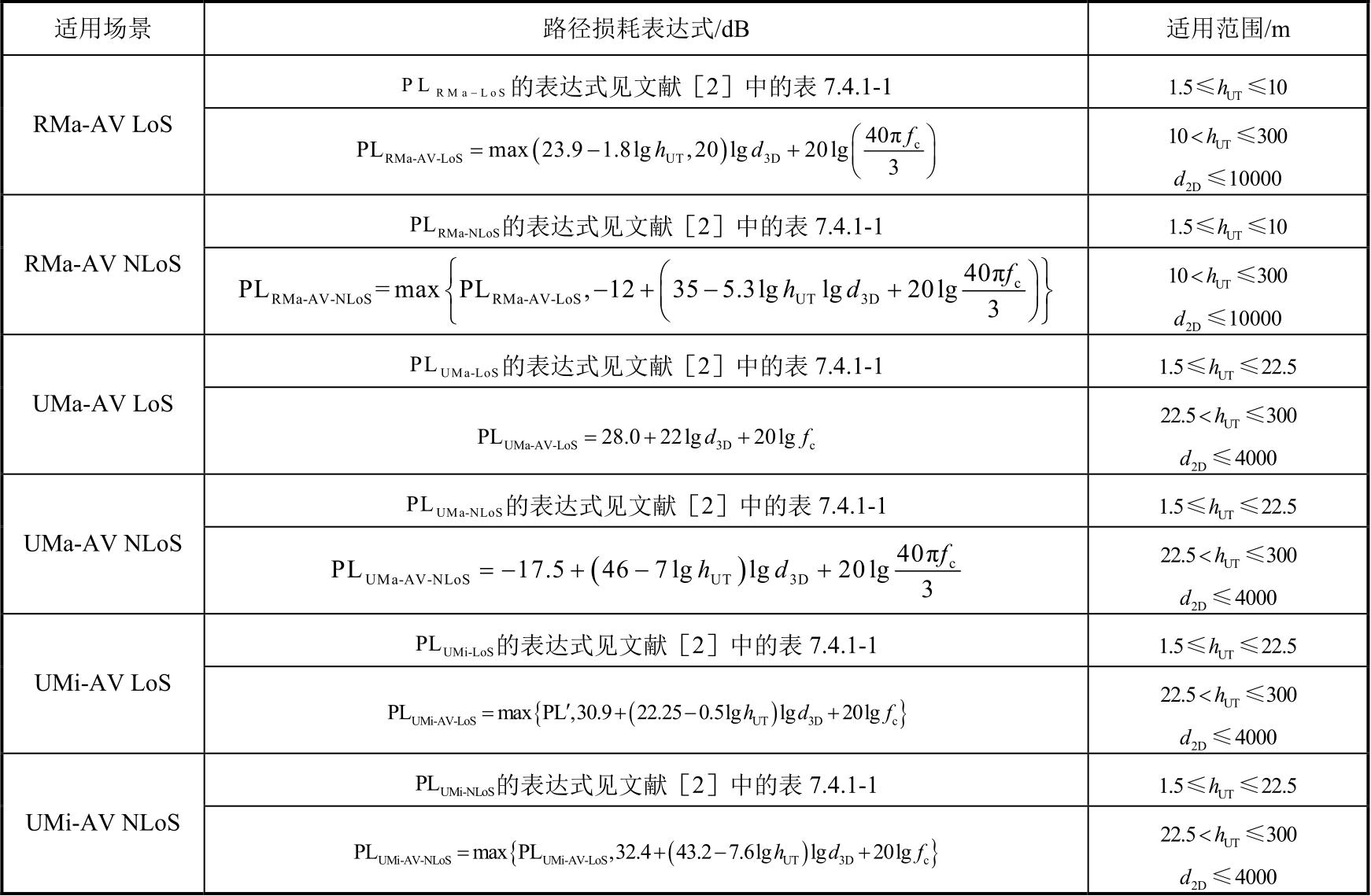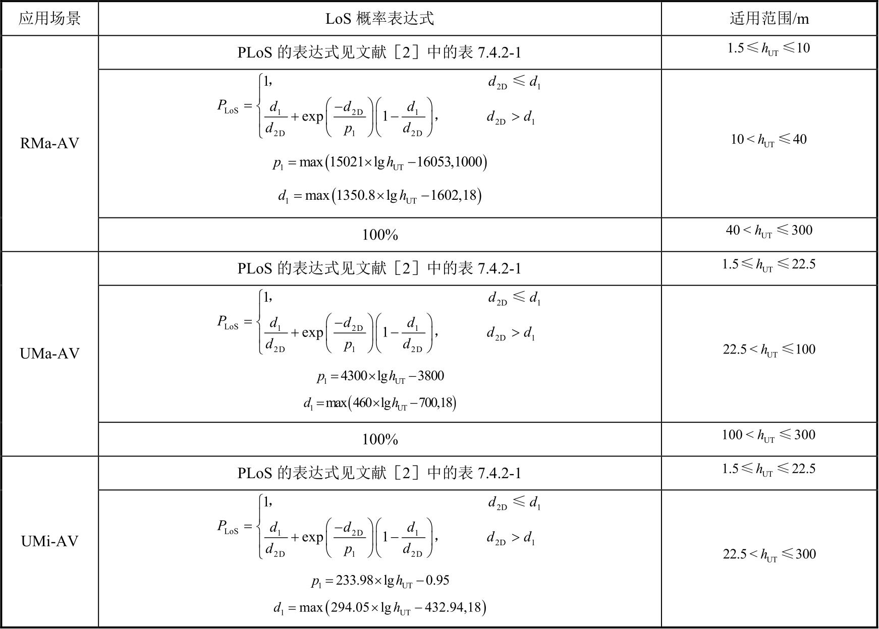 注:LoS概率表达式是在默认的天线高度下得到的,默认的天线高度分别为35m(RMa-AV)、25m(UMa-AV)、10m(UMi-AV); d 1 的单位是米。