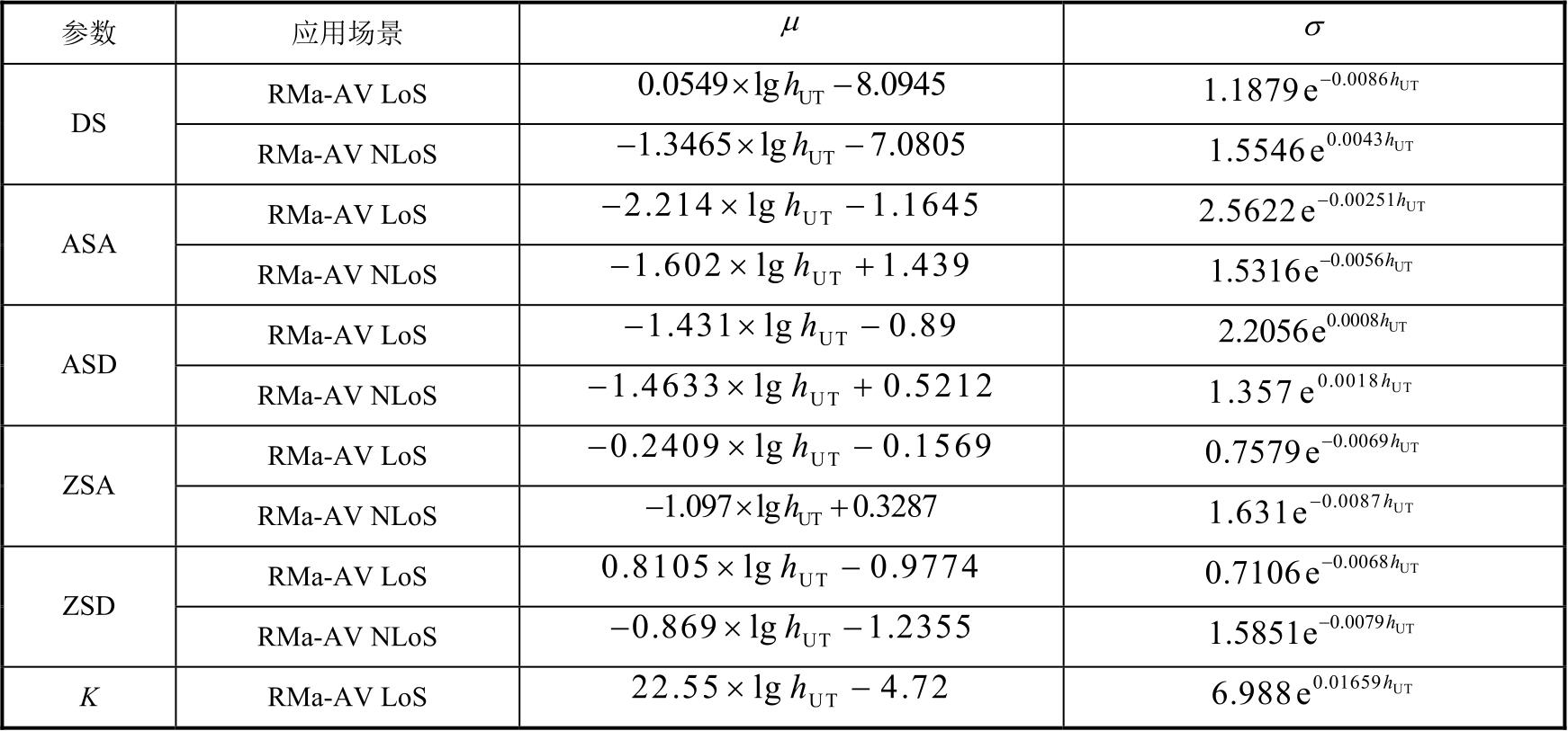 对于RMa-AV和UMa-AV场景,通过修正DS、ASA、ASD、ZSA、ZSD、 K 参数,可以继续使用文献[2]中7.5节的快衰落,修正的参数如表4-8和表4-9所示。