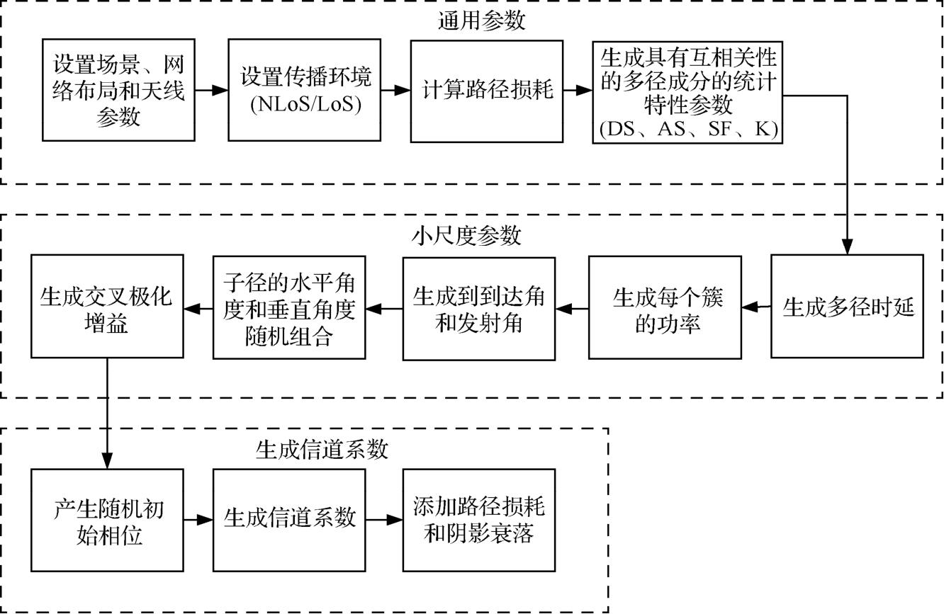 建议信道模型中信道参数的生成过程如图4-4,注意,该图给出的是下行链路的信道参数生成过程,若要建模上行链路,则需要互换角度参数中的发射角和到达角。