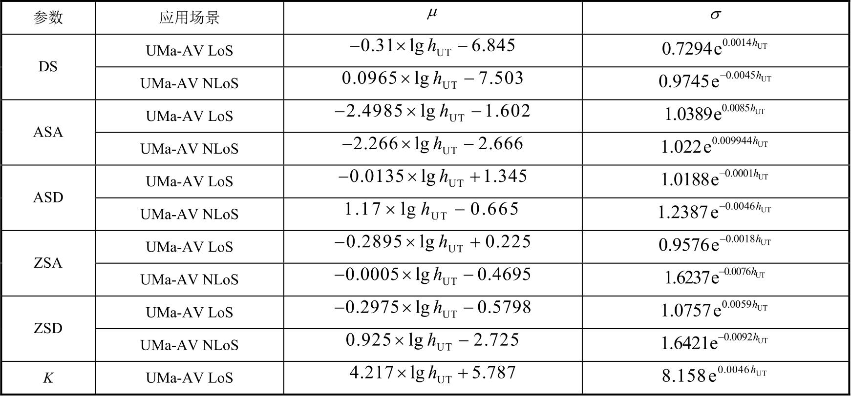 对于UMi-AV场景,根据文献[3]修正DS、ASA、ASD、ZSA、ZSD、 K 参数,可以继续使用文献[2]中7.5节的快衰落。