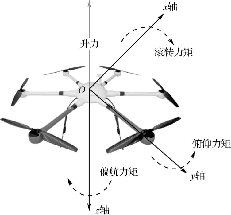 图1-4 多旋翼无人机的升力和不同力矩示意图
