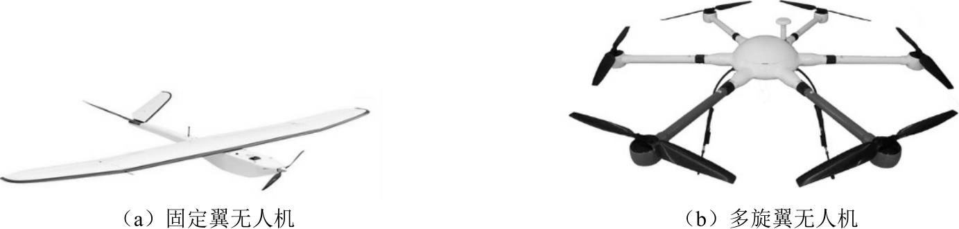无人机通常可分为固定翼无人机和多旋翼无人机 [2] ,如图1-3所示。固定翼无人机的机翼位置基本保持不变,图1-3(a)所示,该类型的无人机利用了民航飞机与军用飞机的设计思想,在其中配备了推力系统。该推力系统可在固定翼无人机的飞行方向产生前向推力,进而根据固定翼无人机表面产生的压强差产生一个能够稳恒上升的升力,以抵消固定翼无人机的重力。一般来说,为了实现固定翼无人机的匀速上升,需要固定翼无人机保持一定的飞行速度。与传统的直升机相比,固定翼无人机结构更加简单、飞行距离更长、能耗更低、续航性能更加优良。固定翼无人机在起飞或者降落时,需要在地面设置一定长度的跑道,以便使其能够更加稳定地起飞或降落。