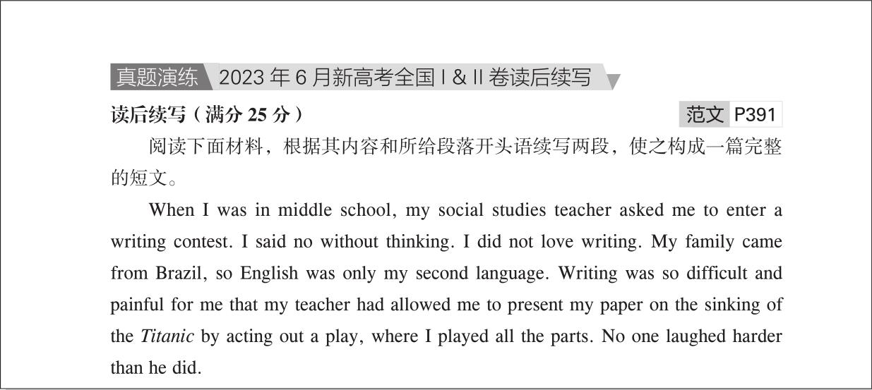 正是在这样的大背景下,我和张立春老师合著的有关读后续写题型的书《高考英语写作:读后续写技巧与素材大全》于2020年出版,一面市就广受全国师生的欢迎与好评,销量节节攀升。但也有不少师生反映说,该书缺少练习,于是就有了这既包含“讲”也包含“练”的第二本书——《高考英语写作:读后续写讲练大全》。