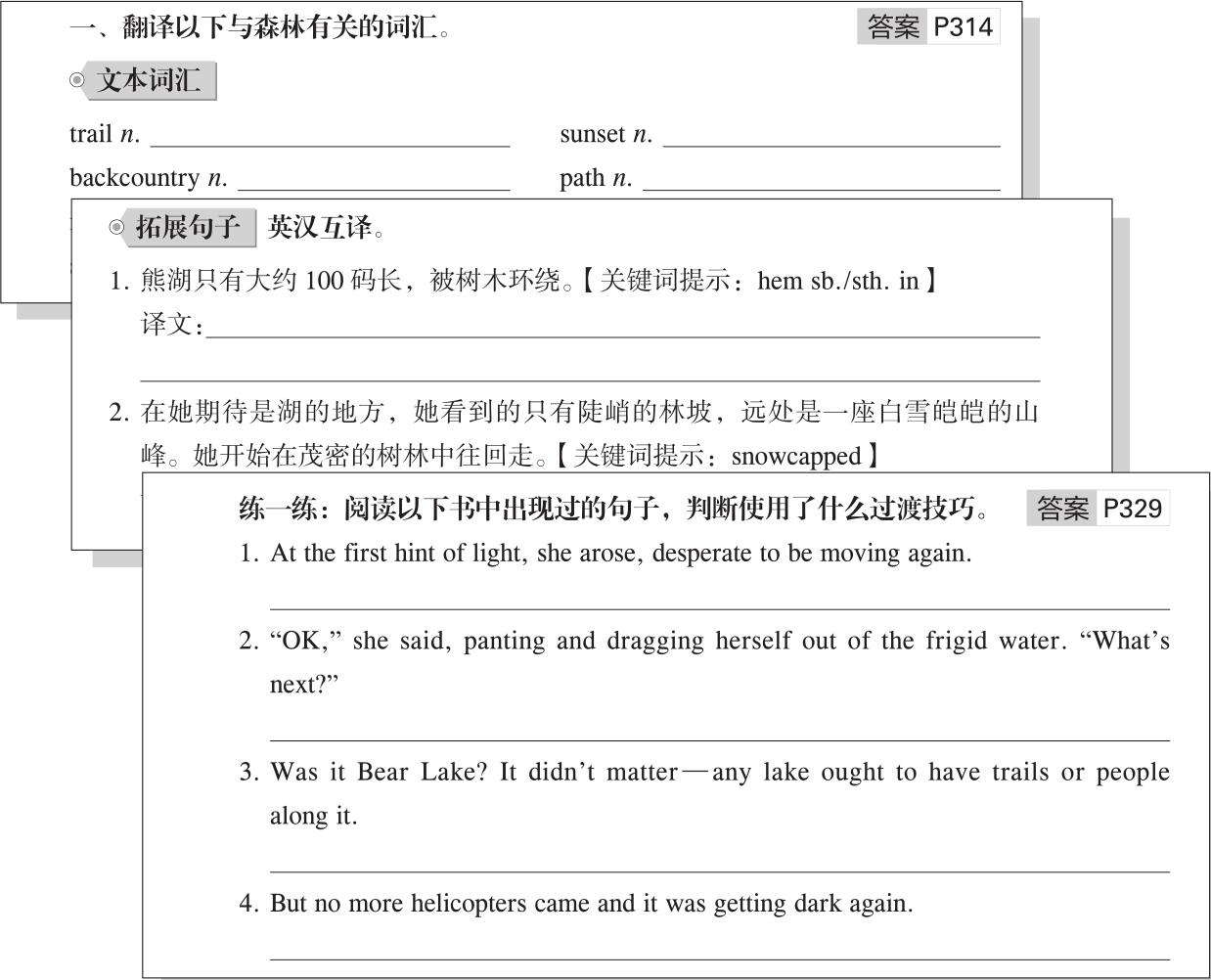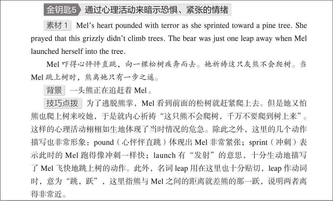 3、写作金钥匙:写作技巧与方法。 结合每篇题源文章中适合续写使用的各类描写(如动作描写、情感描写、神态描写、心理描写和环境描写)以及写作中用到的修辞手法等,进行写作技巧的详细讲解,并配有相应的填空和翻译等练习帮助理解巩固。