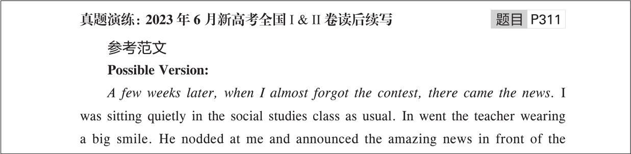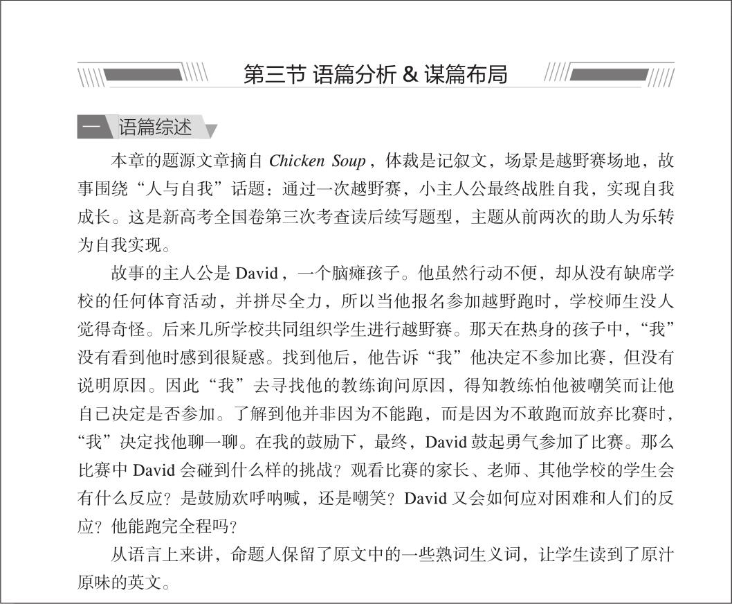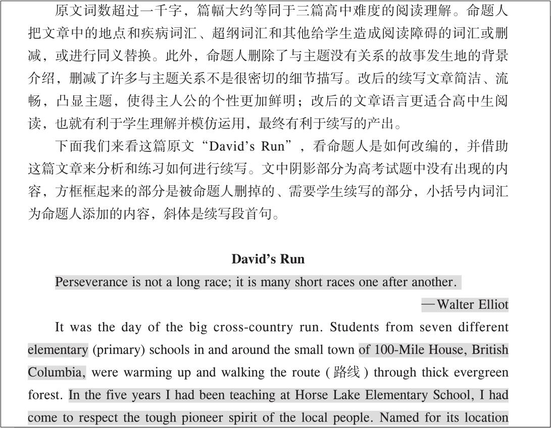 1、开篇:题源文章。 每章开篇先介绍高考英语读后续写真题或模拟题的题源文章,并用符号标注的方式告知读者命题人是如何将题源文章改编成高考题目的。