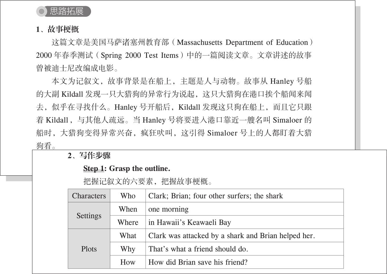 针对每章的题源文章、试题再现和真题/模拟演练,本书提供了详细的语篇分析和谋篇布局策略,将思路拓展按照步骤一步步进行详解,帮助考生从根源上了解和掌握如何续写。