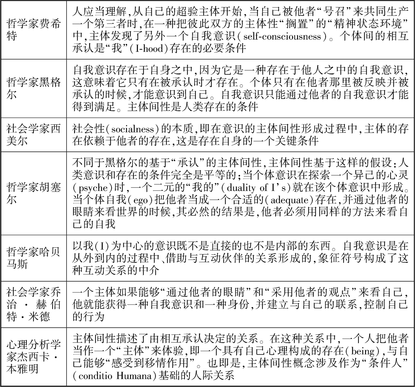 表1-1是对来自不同方法的主体间性的梳理和总结。
