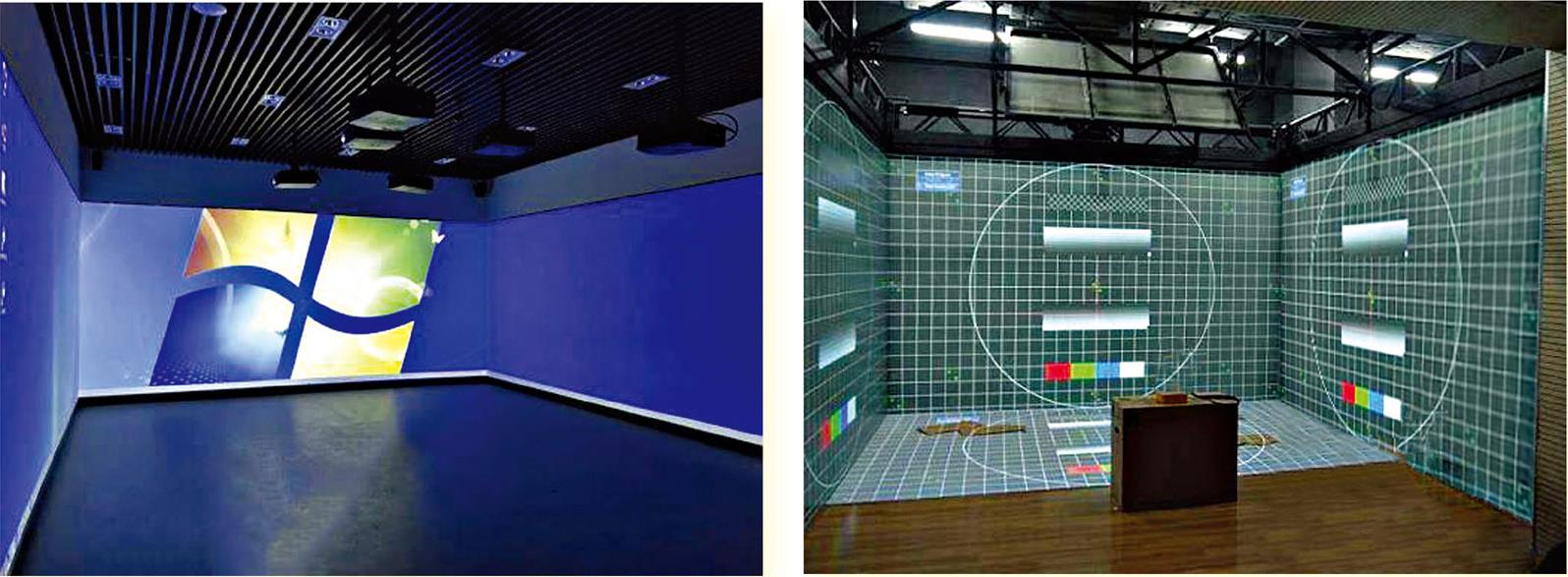 以计算机图形学为基础,把高分辨率的立体投影显示技术、多通道视景同步技术、三维计算机图形技术、音响技术、传感器技术等完美地融合在一起,从而产生一个被三维立体投影画面包围的供多人使用的完全沉浸式的虚拟环境,呈现出无缝、逼真的画面。体验者钻进一个由三面硬质背景投影墙所组成的像洞穴一样的虚拟演示环境中,可以在由投影墙包围的系统中近距离地接触虚拟三维物体,或是随意漫游,感受真实的虚拟环境。如图2-6。