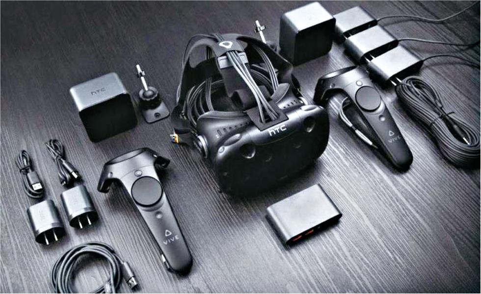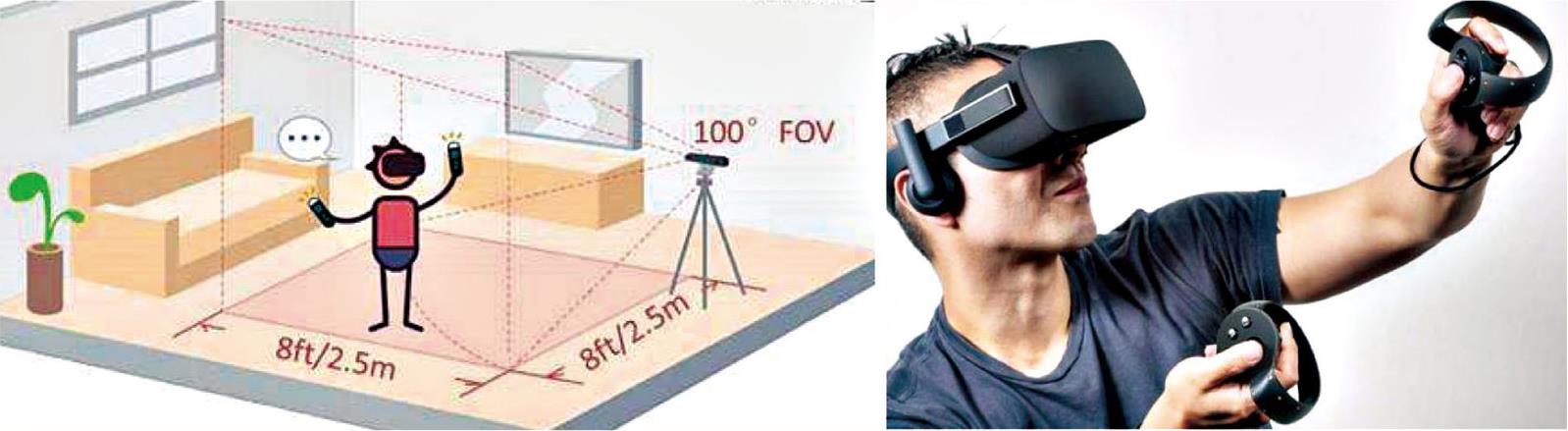 外接式头显(俗称PC VR,如图2-2、2-3),用户体验最好,具备独立屏幕,一般要配备较高性能的台式电脑主机、定位器和手柄,可用于高交互性、高流畅度的VR游戏体验,产品结构复杂,技术含量较高,并且受数据线的束缚,使用者无法自由活动,且对空间的要求较高。