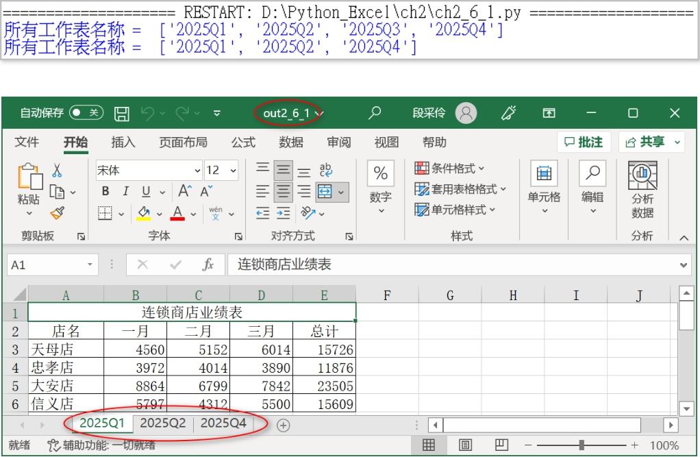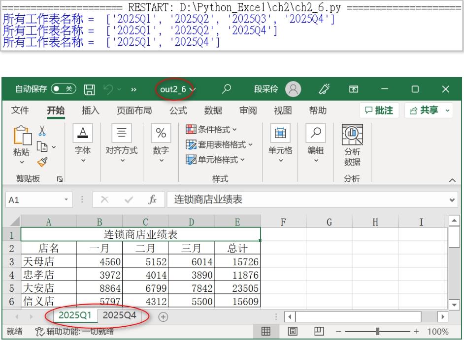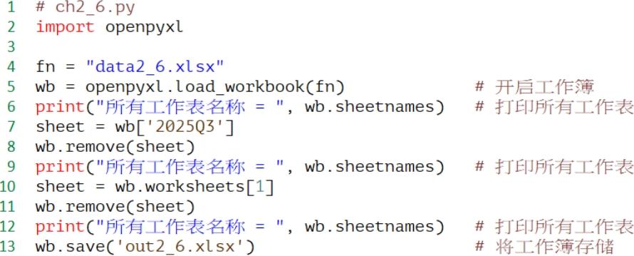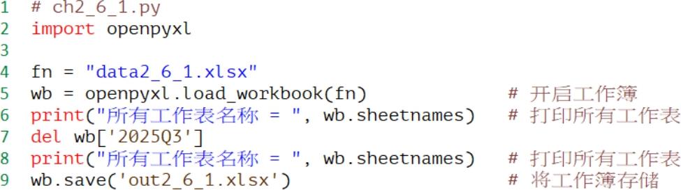 程序实例ch2_6.py: 先删除data2_6.xlsx的2025Q3工作表,然后删除索引1的工作表。