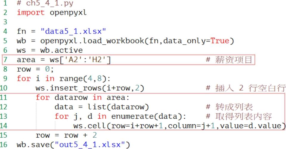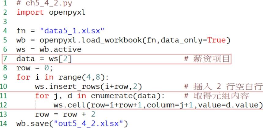上述程序虽然可以得到结果,但是使用了ws[‘A2’:‘H2’]获得了薪资项目,为了要解析出项目内容需使用双层for循环。其实以data5_1.xlsx工作簿而言,我们需要的只是第2行的薪资项目,可以采用3-8节的概念获得第2行数据。