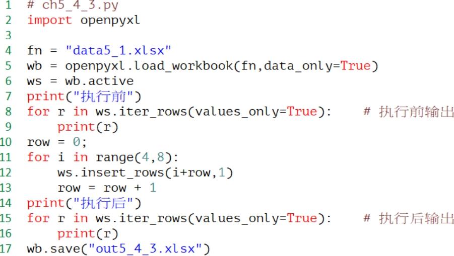 程序实例ch5_4_3.py: 重新设计ch5_3.py,使用iter_row( )函数在执行插入行前和执行插入行后输出行数据,观察插入行的结果。