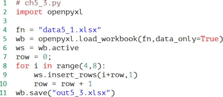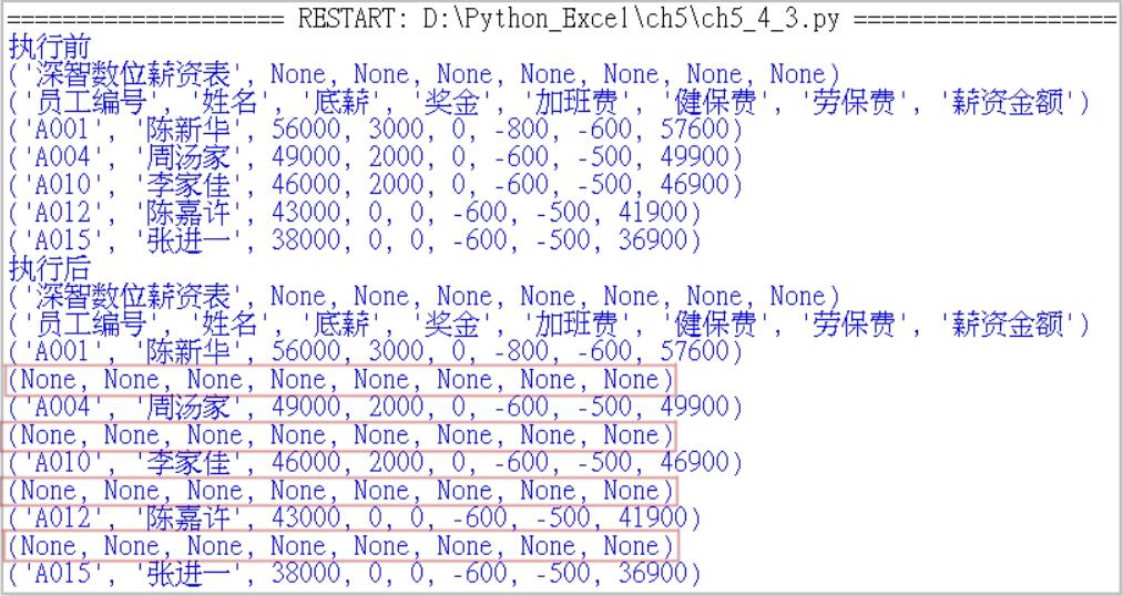 上述框起来的就是插入的行,因为尚未设定单元格内容所以得到None。如果开启out5_4_3.xlsx,可以得到和out5_3.xlsx相同的结果。