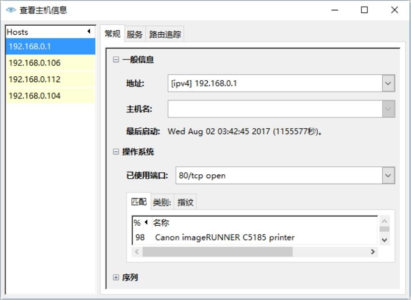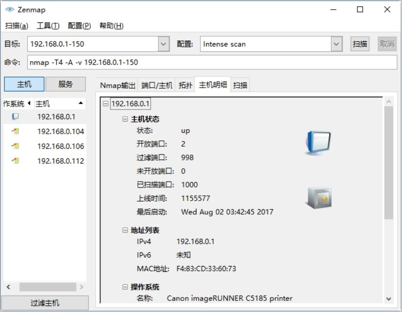 Step 10 在Nmap操作界面中选择“主机明细”选项卡,在打开的界面可以查看当前主机的明细信息,包括主机状态、地址列表、操作系统等,如图2-22所示。