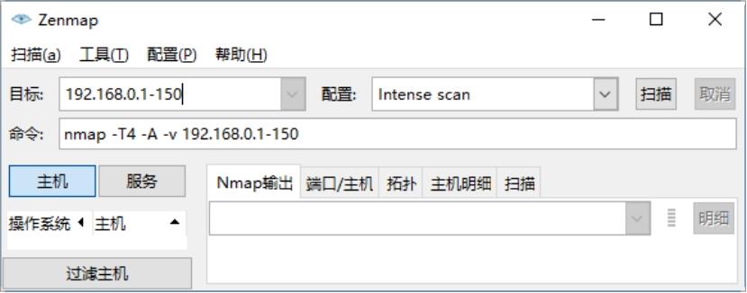 Step 02 要扫描单台主机,可以在“目标”后的文本框内输入主机的IP地址或网址,要扫描某个范围内的主机,可以在该文本框中输入192.168.0.1-150,如图2-14所示。
