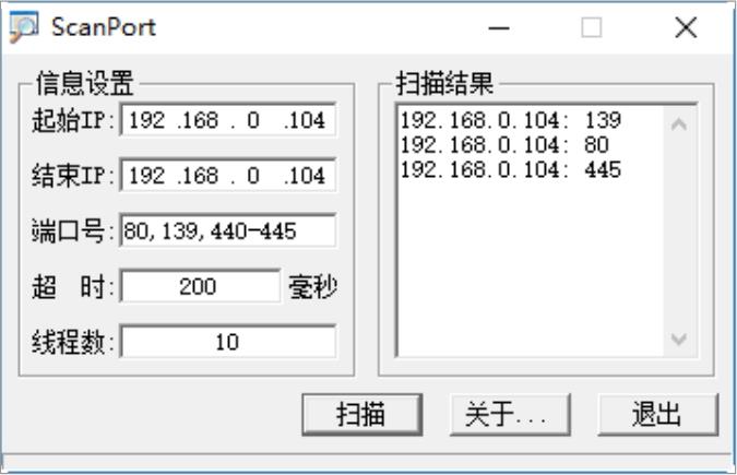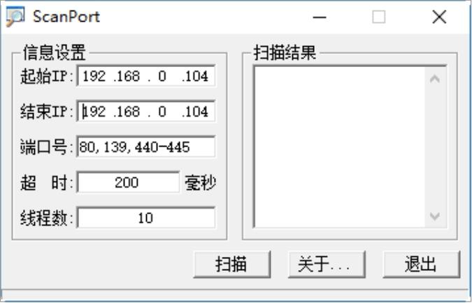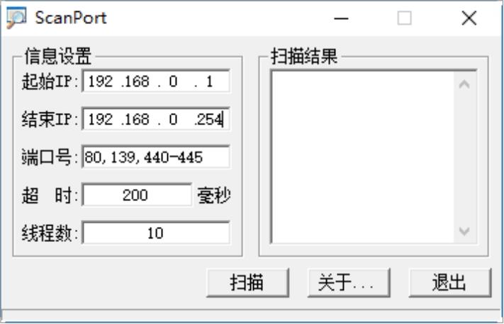 Step 01 下载并运行ScanPort程序,打开ScanPort主窗口,在其中设置起始IP地址、结束IP地址以及要扫描的端口号,如图2-1所示。