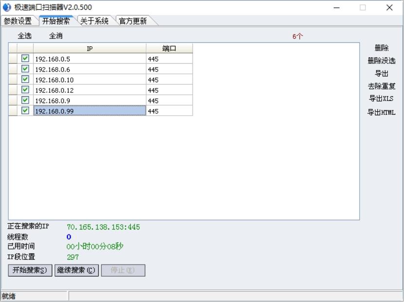 Step 06 设置完毕后,切换到“开始搜索”选项卡下,并单击“开始搜索”按钮即可扫描指定的IP段,最终的扫描结果如图2-10所示。