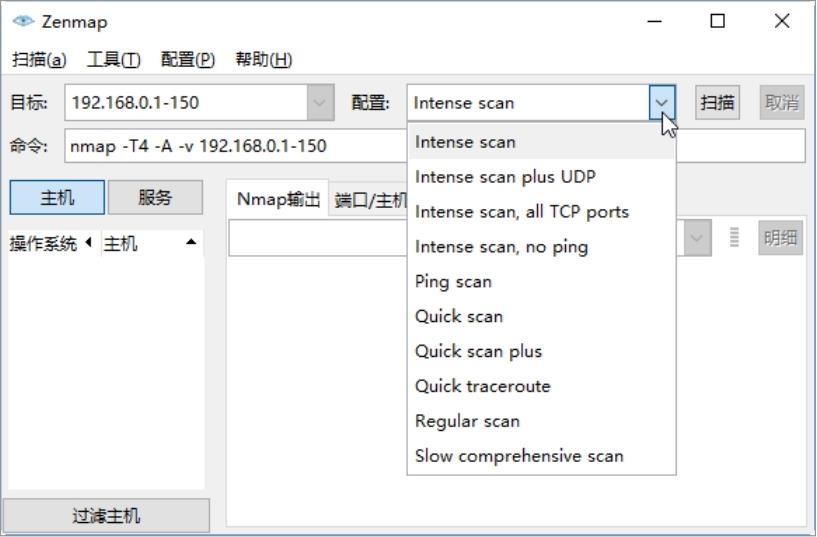Step 03 要设置网络扫描的不同配置文件,可以单击“配置”后的下拉列表框,从中选择Intense scan、Intense scan plus UDP、Intense scan,all TCP ports等选项,从而对网络主机进行不同方面的扫描,如图2-15所示。