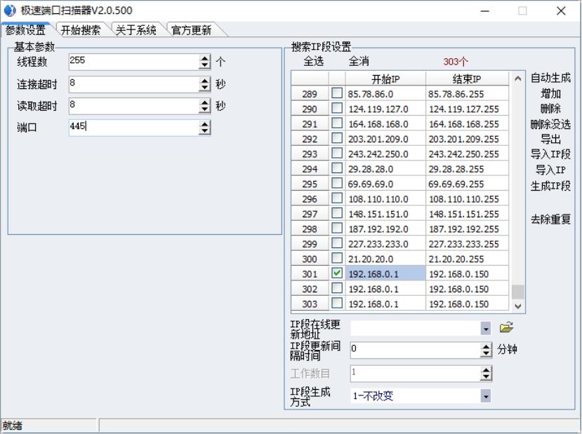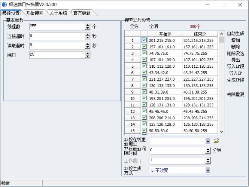 Step 02 切换到“参数设置”选项卡下,在其中即可看到该工具自带的IP地址段以及各种参数,如图2-6所示。