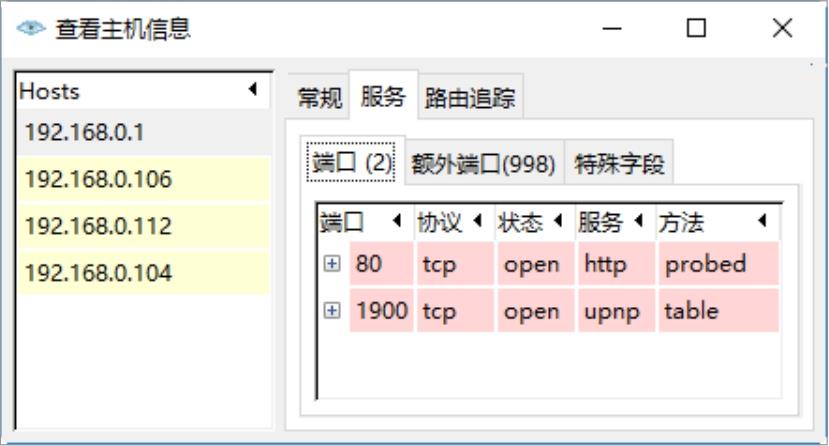 Step 08 在“查看主机信息”窗口中选择“服务”选项卡,可以查看当前主机的服务信息,如端口、协议、状态等,如图2-20所示。