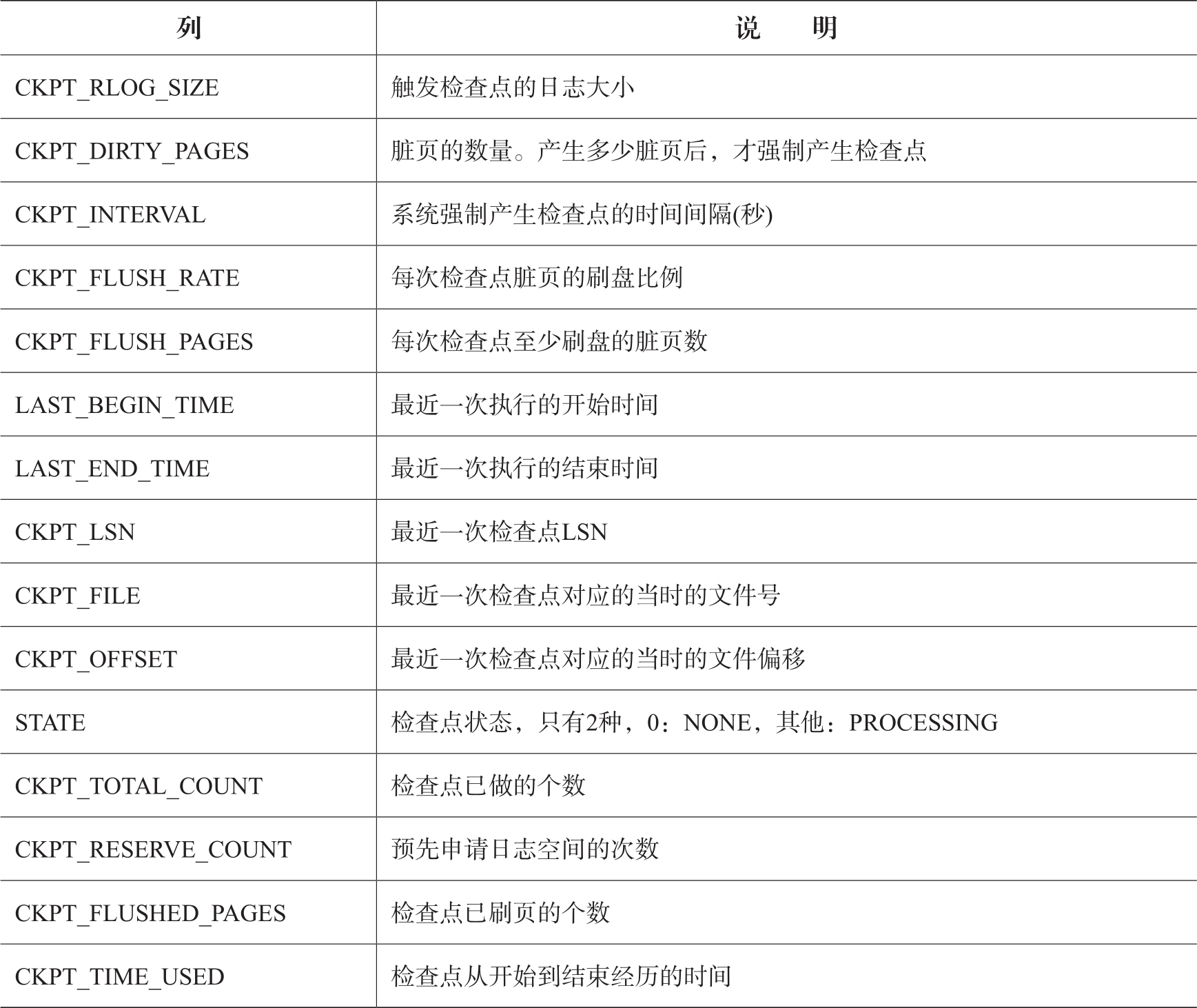 检查点的信息可以从系统视图V$CKPT中查询,内容如表3-1所示。