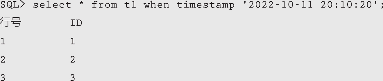 SQL> select * from t1 when timestamp '2022-10-11 20:13:22'; 行号 ID 1 1 2 2 3 3 4 4