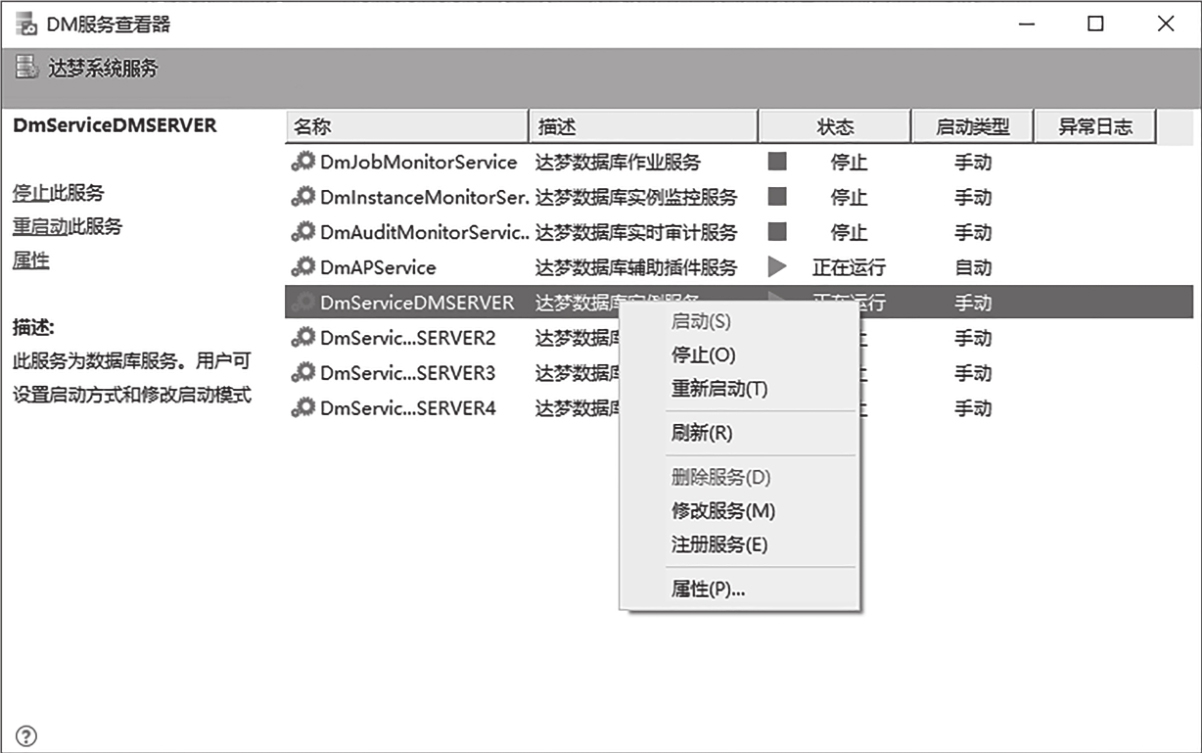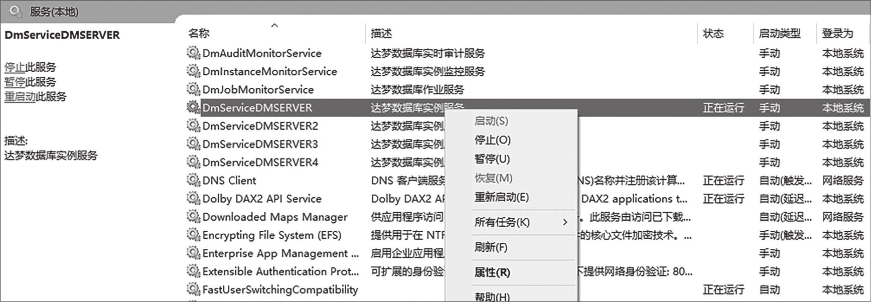 在Windows操作系统中可以直接打开服务管理界面对达梦数据库服务进行启动、停止等操作,如图1-44所示。