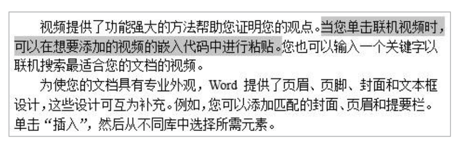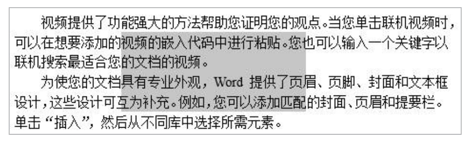 拖动鼠标指针可以选择不规则区域中的文本,这也是选择文本最常用的方法。单击文本范围的起始位置,然后按住鼠标左键,将鼠标指针拖动到文本范围的结束位置,即可选中拖动范围内的文本,选中的文本呈现特定的颜色,如图2-4所示。