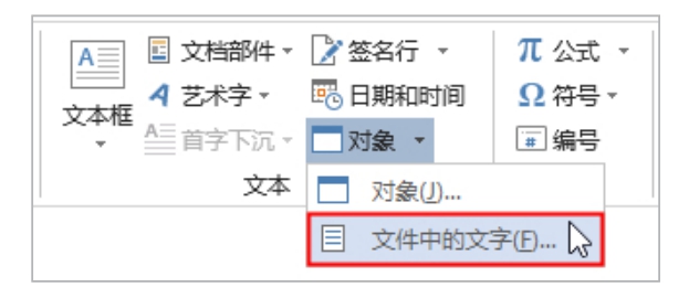 除了从头开始输入文本之外,还可以将现有的Word文档、文本文件或网页中的内容导入到当前文档,只需在功能区的“插入”选项卡中单击“对象”按钮上的下拉按钮,然后在弹出的菜单中选择“文件中的文字”命令,如图2-3所示,接着选择要导入的文件即可。