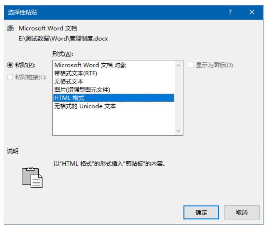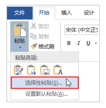 “选择性粘贴”功能可以将剪切或复制的数据以特定的格式粘贴到Word中,具体包含哪些格式由当前正在剪切或复制的数据类型决定。