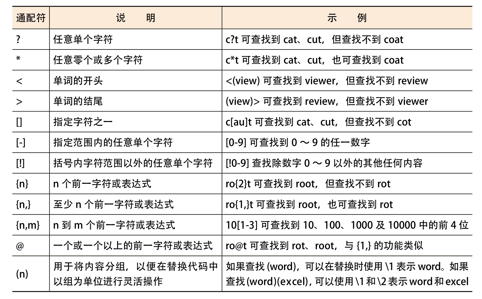 表2-1 Word查找和替换中的通配符
