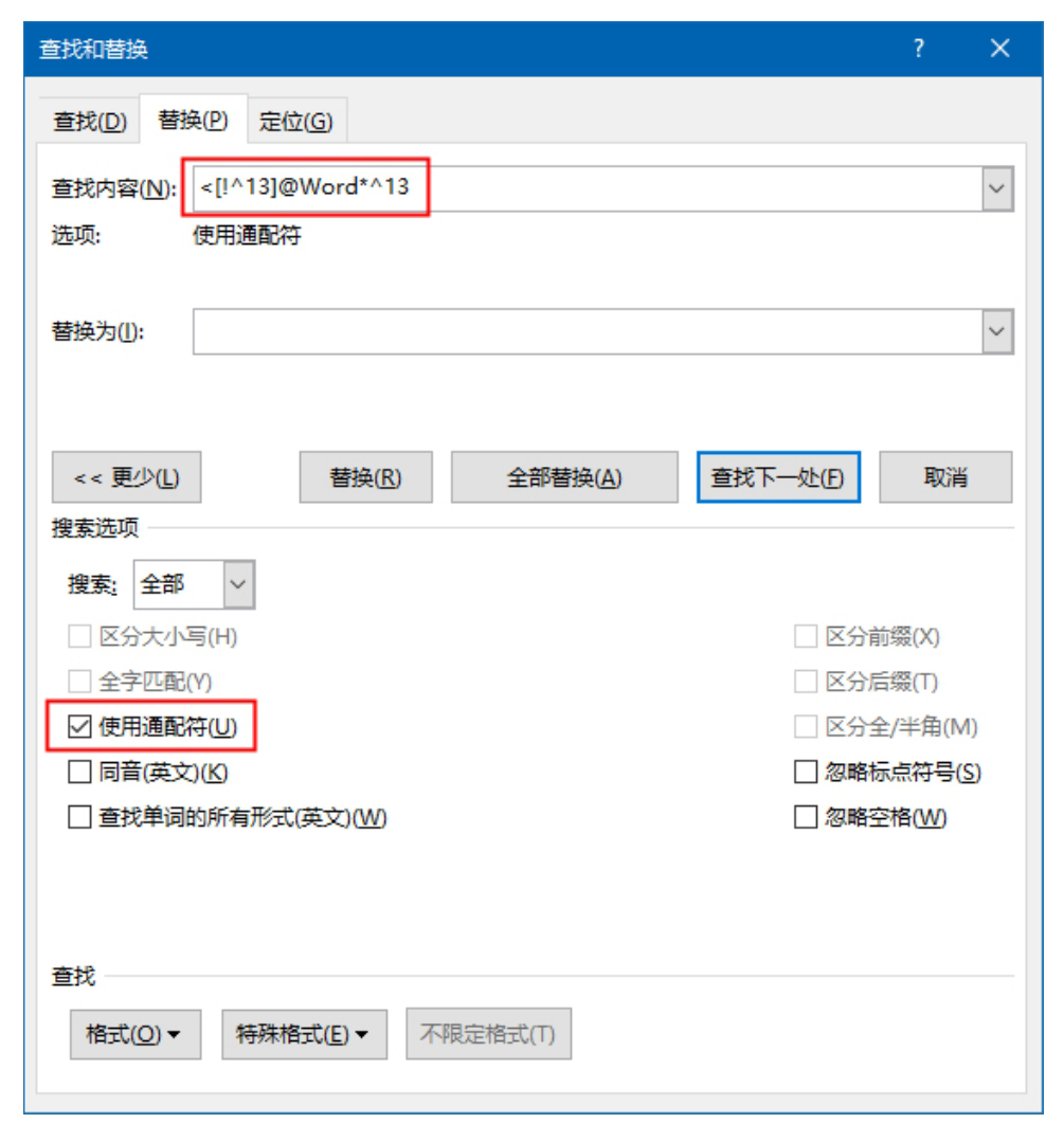 在替换操作中使用通配符时,需要在“查找和替换”对话框的“替换”选项卡中单击“更多”按钮,然后勾选“使用通配符”复选框。