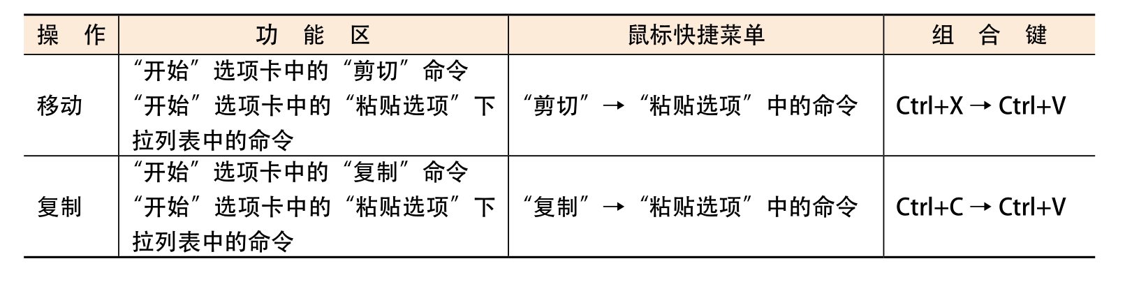还可以使用功能区命令、鼠标快捷菜单命令或组合键来执行移动和复制文本的操作,如表2-2所示。