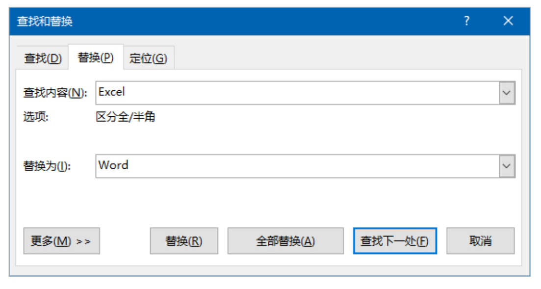如图2-8所示表示在文档中查找“Excel”,然后将其修改为“Word”。