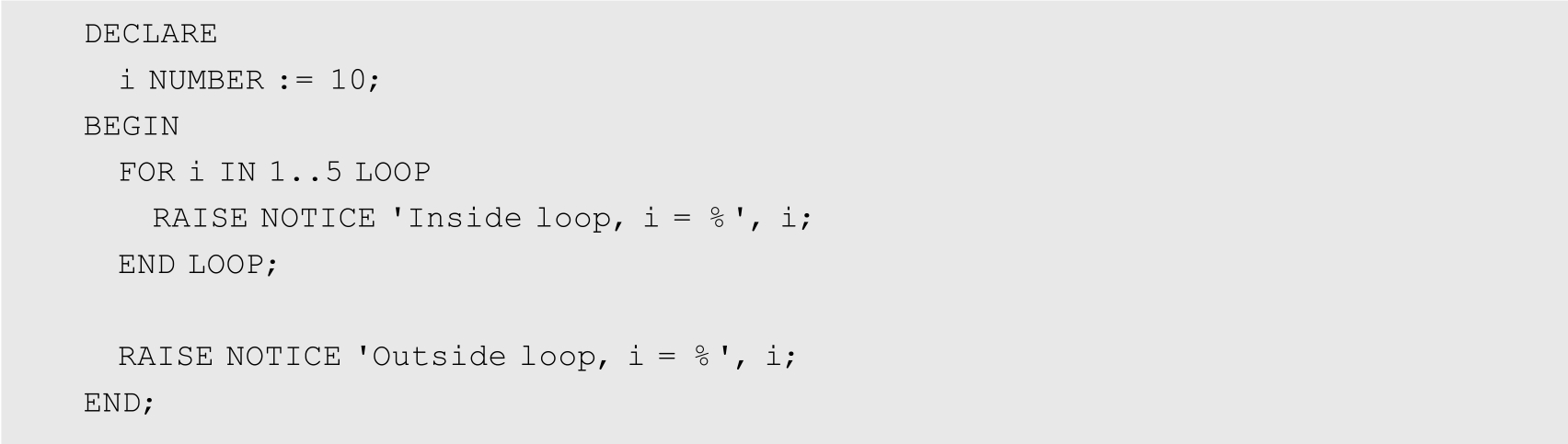 如果FOR LOOP语句的索引与匿名块中声明的变量同名,则本地隐式声明会隐藏另一个声明,如本例所示,程序代码如下。